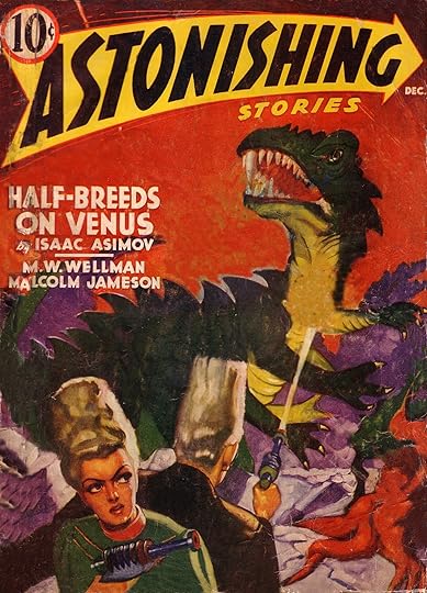 "Half-Breed" was a number of firsts for Asimov. The Astonishing Stories February 1940 issue was the first time Asimov had his name on the cover of an SF magazine. The story was 9000 words long, so it appeared as "a novelette," also a first for the Good Doctor. Best of all, the story was popular enough that Pohl asked him to write a sequel, something he had not done up to that point, though he would in the future with his Foundation series. "Half-Breeds of Venus" appeared in Astonishing Stories December 1940 and was another first. The cover art for the issue featured Asimov's story, not just an author mention. He'd "made the cover," a big deal back in those pulp days.