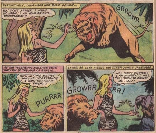 This second trip to the jungle doesn't have as much "jungle-ness" to it, but it still gets in some minor Tarzania. Lena, when she speaks to her animal friends (more for effect than need, as she can control them silently) she speaks the "jungle language," which the animals can understand, including "Urtah! Itay! Kabray! Despite sounding like Pig Latin, it is descended from Tarzan's "Bundalo" and "Kreegah!" that is familiar to fans of both the comics and original stories. Typical to most jungle queen stories, Lena uses her amazing powers to stop poachers who are stealing from the Elephant's Graveyard. She also directs one of her apes to rescue a man from quicksand.