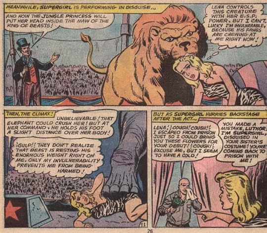 During Lena's premiere she is once again tortured by the idea of being ridiculed as Lex Luthor's sister. She can't perform, so Supergirl takes her place. Since she can't control the animals with her mind, it is Supergirl's strength that saves her from the lion's mouth and the elephant's foot. As Superman saved Lois Lane from harm in "Lois Lane, Jungle Princess," Supergirl does the same for her friend this time.