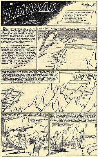 Zarnak lives on the Earth of 2936, a planet regressed to medieval superstition after World War 5. Building a rocket plane, Zarnak leaves Earth in search of a spaceship that fled the planet and may have the last remaining scientifically civilized humans left. But Zarnak gets into trouble right away when a meteor plugs his rocket tubes. He is headed into the sun, but lands on the undiscovered first planet, Vulcan. There he finds slugs who eat metal and he uses them to unplug his ship and escape. He crash-lands on Mercury and meets the "crazy ones," beings with large, bulbous heads and are ruled by Thark. Zarnak is sacrificed to a giant bird that takes him to a city on the cold side. This city is inhabited by scientists who want to cut Zarnak up to discover the secret of longer life, because they live for only twenty-four years. Zarnak is saved by the beautiful Etarre, who takes him away in her plane, but they are shot down by Thark who puts them in his new machine that is supposed to separate their souls from their bodies. Zarnak fools Thark into thinking they have been freed, lures him to his ship, straps a jet pack on him, and is rid of the fool. The duo flies to the Hollow Mountain where Etarre betrays him to the Supreme One, giant-headed Vaeco, who wants to burn Zarnak alive. Vaeco relents and explains that he and Etarre are from Venus. Etarre was born looking like an Earthling, so Vaeco fled with her to Mercury, where he rules like a god. Zarnak becomes part of the team. He goes on a secret mission to find a rogue scientist living amongst the "crazy ones," finds their secret generator base, and is attacked from behind...The strip was dropped and the next installment never appeared.