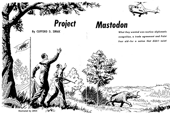 Sometimes writers write messages for their future selves. A great example of one who did this was Clifford D Simak. The March 1955 Galaxy published a Simak story called "Project Mastodon." And it was a worthy time travel tale about creating new countries in time, not space. Three friends invent a primitive time machine that can make 50,000 year leaps, but find it very hard to profit by it when nobody will take them seriously. The US military treats them like a bunch of crackpots. When the men get stranded in the past after a mammoth crashes into their helicopter, they wrack their brains for someway to get back. The problem isn't the time machine, but the height. If they were to go back standing in Mastodonia they would end up under tons of earth. In the end, one man manages to get home but we have to wait to see if he can save his friends, even with the help of the military man who never lost faith that the travelers would return.As time travel stories go, it is typical of the 1950s. No Morlocks here, only a puzzle story and a little action with sabertooths and mammoths. But buried in that story is a nugget, a time-release seed that will twenty-three years later become the novel Mastodonia. That little, almost unimportant fragment is a character named Pritchard, who is studying Law while the time machine inventors study Engineering. During a bull session on time travel, Pritchard pipes in: "If you guys ever do travel in time, you'll run up against more than you bargain for. I don't mean the climate or the terrain or the fauna, but the economics and the politics." In the scope of "Project Mastodon" this means the stuffy military men who poo-poo their suggestion of recognizing Mastodonia as a country and using it as a sanctuary in the case of a nuclear strike.