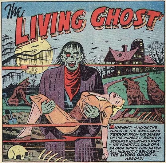 "It Walked By Night" is a story of a family curse that haunts a seaside hotel. In 1750, a young fiancé is murdered by a jealous member of the Aram family. With his dying breath the victim curses the murderer. In 1950, a newlywed couple, Roger and Sylvia, come to the hotel where the visitors are terrorized by a shambling form from the sea. The curse of Aram arises a hundred years later. Art by Max Elkan."The Cursed Pistol", a one-pager, follows a cursed gun that's responsible for many unfortunate deaths. In 1943. the owner wishes it to never kill again, and snaps it in half. Unfortunately he gets blood poison from breaking it and dies.