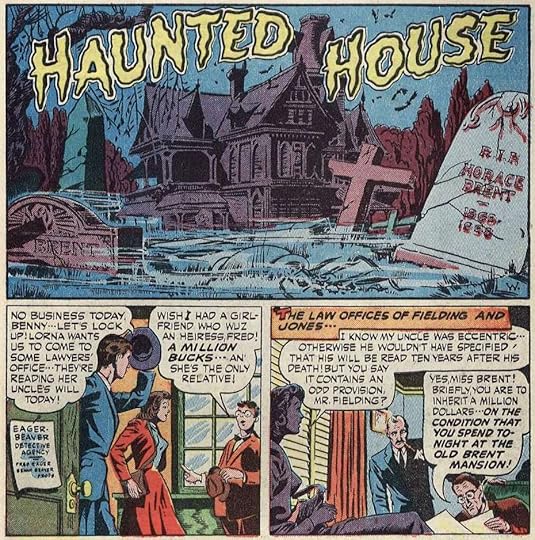 "Haunted House" features Benny and Fred of the Eager Beaver Detective Agency. Fred's girlfriend is to get a million dollars if she can spend one night in the haunted house she is to inherit. Ghosts, clanking chains, and a creepy portrait of an old man holding a cane are all props in this tale. To no one's surprise, the ghosts turn out to be the lawyers who have embezzled all of the inheritance. This story has a more humorous feel than the rest of the issue as it is a familiar plot of several movies including Abbott and Costello's Hold That Ghost (1941). The art by King Ward is my favorite of the issue, having a goofy feel that is perfect for a madcap horror tale.