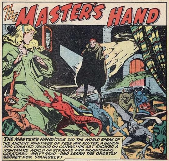 "The Master's Hand" returns to the "Pickman's Model" idea, telling of an art student, Betty Saunders, who has thoroughly studied the great macabre artist Kees van Ruyter. A mysterious man hires her for her artistic abilities, but when Betty arrives in Europe, she finds that her patron is a ghoul who plans on conjuring all the phantoms and monsters from van Ruyter's paintings. And Betty will paint new ones to expand his army. Only the phantom van Ruyter himself can save her. Art by Max Elkan."Phantom of the Seas" has Captain Wolfson strangled by his mutinous crew, then his spirit is trapped in a bottle with a model of his ship. In the present day, the Knowles family buys the ship-in-a-bottle and young Stephen uncorks it, releasing the ghost. Only the connection between the ghost and the ship will save them. Art by Paul Reinman.