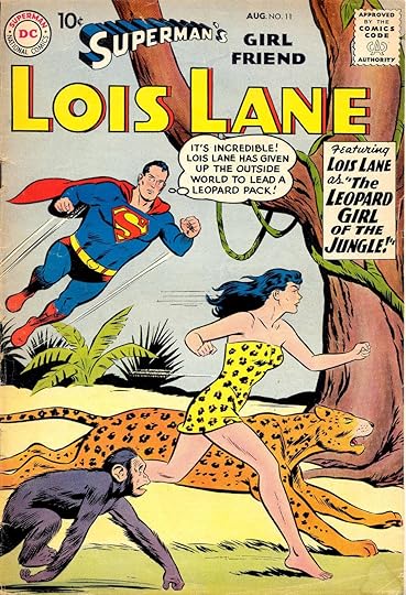 Issue #11 (August 1959) is a my favorite of them all. "The Leopard Girl of the Jungle" was written by Bill Finger and drawn by Kurt Schaffenburger. In this story, Lana Lang wants to see Lois. Lois, being ever jealous of Superman's first girlfriend, thinks the worst. But what Lana really wants is for Lois to read her new novel. It's a jungle thriller that's been rejected because it's too far-fetched. Lois reads the book, but has an interview in Africa, so she hops a plane. Which, of course, crashes and Lois loses her memory. She thinks she is a leopard girl and takes up with pack of leopards. (We'll come back to that one.) Superman finds her and restores her memory but Lois refuses to leave the jungle. She is determined to prove that a jungle girl can do all the things that Lana wrote about. Lois goes on a dangerous jungle crusade and accomplishes all of Lana's jungle adventures (with Superman always ready to surreptitiously save her, like pulling the crocodiles down in the river so they can't attack the swimming jungle queen and her furry companions). She returns with her proof and Lana's book becomes a bestseller. Superman is impressed by Lois's kindness to Lana (which Lois only admits to herself is why she did all those crazy jungle stunts.)
