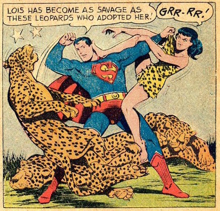 Now Bill Finger could have done some research and learned that leopards don't live in packs. And he could have acquired more in-depth, African geographical and political knowledge. Except that would have ruined the whole thing. Because Finger didn't want to write a real jungle adventure. He wanted to write something that harkened back to the jungle queens of old, like Sheena, Rulah, Camilla, and Cave Girl. And this is exactly what he does. Lois wears leopard skins. She escapes stampeding elephants and raging grass fires. She swims in crocodile-infested waters. The only thing she doesn't do is use a knife. This might have been a Comics Code issue or simply because Superman is continuously acting as her security blanket.