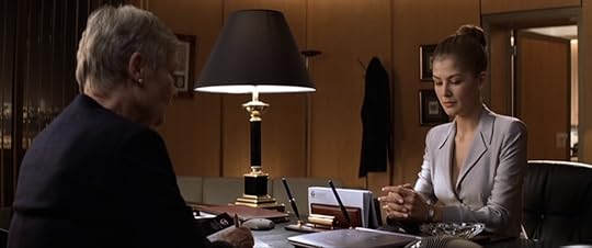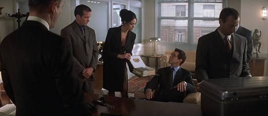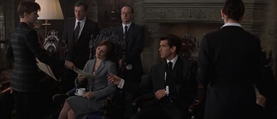 Moneypenny is also acting rather uncharacteristically, at least in comparison to Samantha Bond's portrayal in the last couple of movies. There was no flirtation between her and Brosnan's Bond before, but this time when he says he brought her something, she asks if it was chocolate or an engagement ring. And when she finds out what it really is - a cigar tube - she observes that it's not very romantic. That threw me at first until I realized that there's nothing really flirty in her delivery. She's not mutually playing with him, she's teasing him. He wants it to become flirting, but she's detached from it and completely in control.