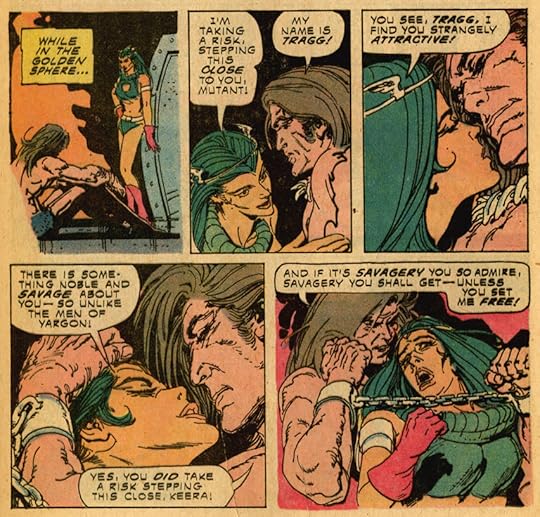 Tragg and the Sky Gods features Tragg and his lover Lorn (not a guy, but a hot red-head in a fur bikini), two advanced cavemen who, as children, were genetically manipulated by aliens from Yagorn with an evolvo-ray. The only problem is that the aliens left Earth and returned twenty-five years later. During that time, the benevolent scientists have been replaced by conquerors. No longer is the mission to help man evolve, but the enslavement of the human race! Tragg and Lorn have to leave their people but stay close to guard them against Zorek (a true Ming-wannabe, moustache and all) and the Sky Gods' nefarious schemes. There's only one problem for the dictator: his fiancée Keera has fallen for Tragg with his burly cave muscles. And despite having jet packs, ray guns, evolvo-rays, and - one would think - highly developed scientific knowledge, the baddies fail. Armed only with spears, dinosaurs, and Keera's treachery, Tragg and his friends set the invaders back, crippling their ship, destroying their volcano base, and stemming the coming invasion from Yagorn.