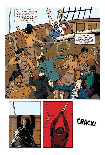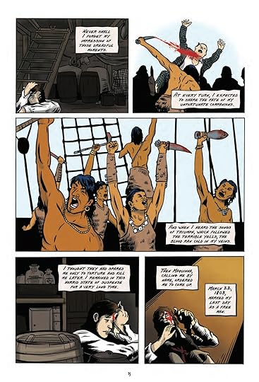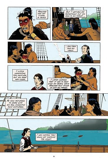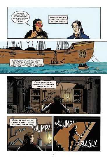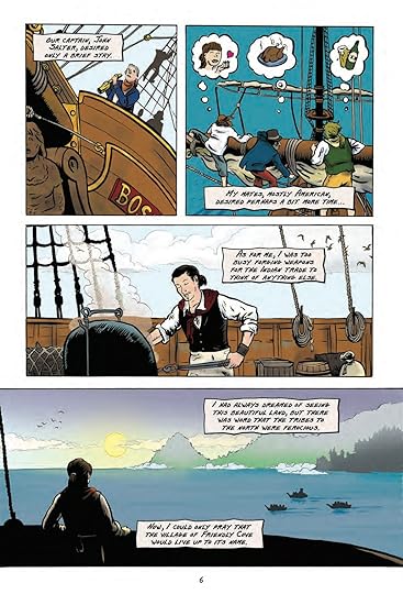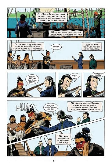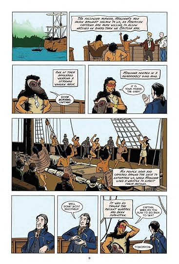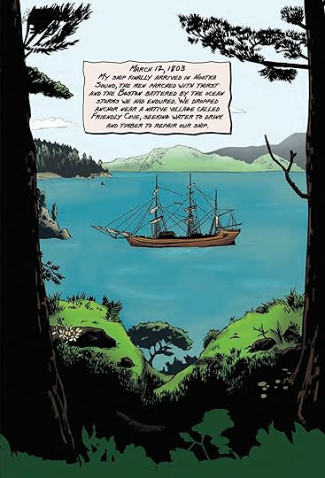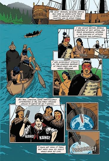 I'm not shy about my love for sea adventure, but you may not know that I'm also a huge fan of stories about indigenous people, especially of North America. Not that I'm claiming to be a valuable or even that well informed an ally, but I've always felt a lot of empathy for Native Americans since I was a kid watching Westerns and recognized that most of the time I wasn't getting both sides of the story. I've been hungry for the Native perspective ever since. A couple of my favorite graphic novels so far on the subject have been George O'Connor's Journey into Mohawk Country and the Graphic Classics anthology Native American Classics (which I reviewed for School Library Journal). Time to add to that list with Rebecca Goldfield and Mike Short's Captive of Friendly Cove .