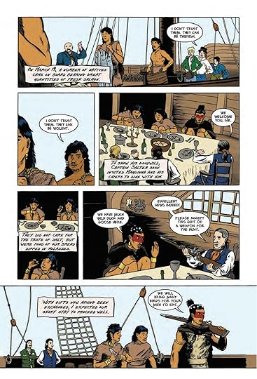 I don't want to give too much away, but even though I didn't agree with many of Jewitt's decisions, I was captivated by his story and wanted a happy ending for him. More than that though, I learned a lot about the Mowachaht from the early 19th century, which was what I hoped for. That's as much due to Mike Short's images as to Jewitt and Goldfield's words. He gives life to the story and tells it in a clear and compelling way. He's aided by impressive inks from Matt Dembicki and a gorgeous color palette from Evan Keeling that brings to the page very nicely the beauty of the Pacific Northwest.