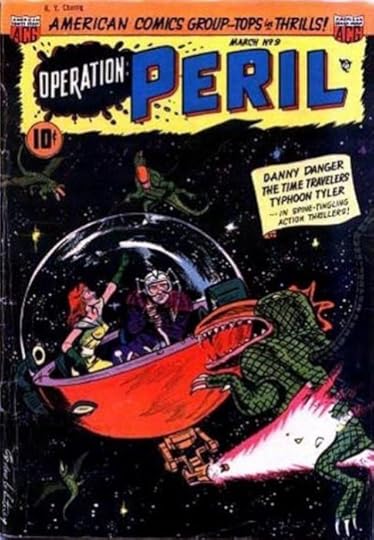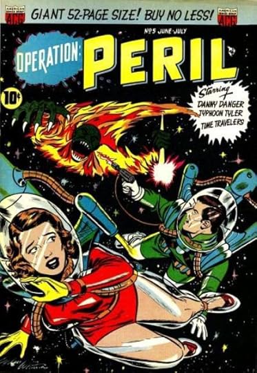 Science fiction comics usually run in anthologies of similar material. Forbidden Worlds, Mystery in Space, even Space Westerns. All their stories are clearly marked as fantastic in nature. This is why "The Time Travelers" (#1 October-November 1950 - #12 August-September 1952) in American Comic Group's Operation Peril was so unusual. The rest of the strips that accompanied the time-slipping tales of Dr. Tom Redfield and his companion Peggy Foster were the sea adventures of Typhoon Tyler and the detective cases of red-headed Danny Danger. All three strips got cover space and none of the three could be said to overshadow the others.