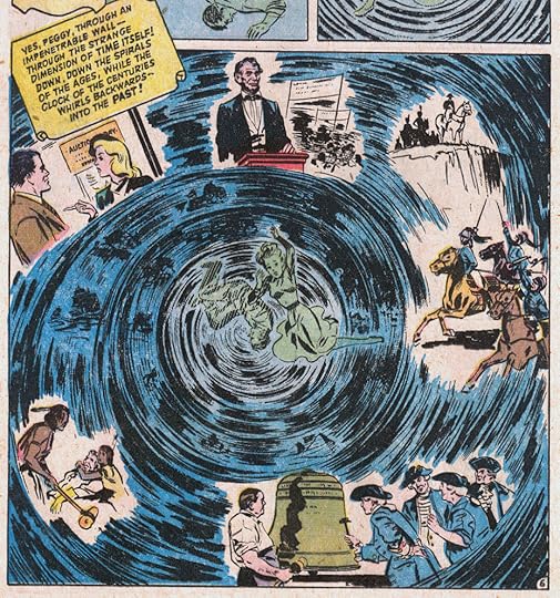 Issue #5 (June-July 1951) has a best selling historical author named Blake force Tom to take him to the age of pirates. The writer wants to give Anne Bonny, the famous woman pirate, modern guns so that she can acquire even more treasure, which Blake will get in the future. (I guess best selling authors don't make as much as they do now.) Tom and Peggy are stuck in the past because Blake has the key to the time machine. Blake and Anne begin a campaign of robbery that ends when a British warship attacks the pirates. Tom slows the pirates down by dropping a sail on them. The British arrest Anne, and Tom kills Blake with a sword. Tom reveals to Peggy that he had a duplicate key all along. Peggy suspects Tom has fallen for Anne Bonny but Tom explains that he knew Anne would be captured in 1720 and he wanted to make sure history was not changed. This is the last issue that hinges on Peggy's jealousy over other beautiful female characters, but she'd turn the tables in a few issues. It is also the only storyline that worries about preserving the timeline.