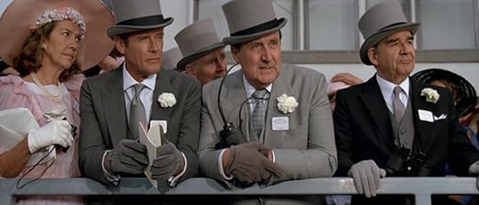 The hat rack gag makes another appearance. This time, Bond is about to toss his hat, but notices a fancy, flowered hat already on the rack. That distracts Bond, so he just places his hat on the rack instead. It turns out that the flowery hat is Moneypenny's race-wear and he almost tosses it on the rack at the end of the scene, but Moneypenny stops him.