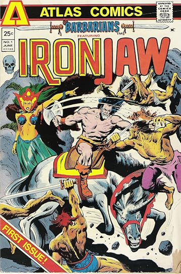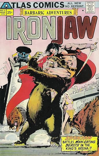 Ironjaw's creator, Mike Fleisher, had a bad boy reputation in comics. At DC he wrote such downer characters as the violent Spectre and the unattractive gunslinger, Jonah Hex. He left DC to join Atlas and create the barbarian Ironjaw, giving him the same name as the 1942 Lev Gleason Nazi villain from Boy Comics, even the same wide metallic mandible. Much has been made of the essay at the end of the first issue where the editor tells about Fleisher's method of writing Ironjaw, basing it on "what a real man, placed in that same situation, would do." Sadly, this drive for "realism" means Ironjaw is a robber, a rapist, and an idiot. He lacks Robert E Howard's brooding fatalism and comes off like an adolescent.