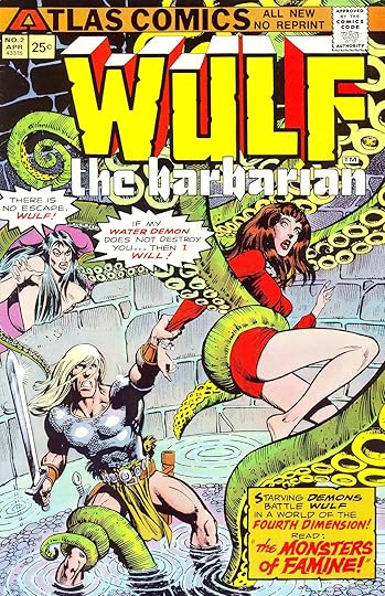 In the second issue (April 1975) Wulf takes up with a swordswoman, a rogue, and a magician to kill a wizard who has plagued the land with drought. Like the Conan story "Rogues in the House," they enter the wizard's domain and confront horrors, including a giant water demon named Bel-Shugthra. Sacrificing one of his comrades, Wulf summons a fire elemental to fight the water demon. They flee and the tower explodes House of Usher style. Of all of Wulf's adventures this one is closest to Robert E Howard. (Well, Lin Carter and L Sprague de Camp anyway.)