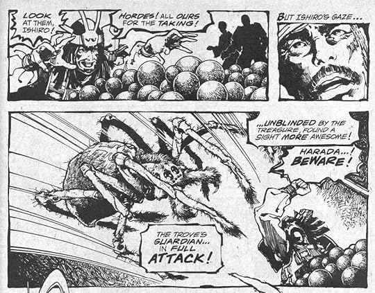 But Atlas wasn't quite done with sword-and-sorcery yet. "Temple of the Spider" appeared in their black and white magazine, Thrilling Adventures Stories #2 (August 1975). This was written by Archie Goodwin and drawn by Walt Simonson, who both knew plenty about sword-and-sorcery comics. Goodwin wrote the first and most important sword-and-sorcery stories for Warren between 1965 and 1967. Walt Simonson worked on Sword of Sorcery at DC in 1973 and then wrote and drew a sword-and-sorcery parody, "A Tale of Sword & Sorcery" for Star*Reach #1 (April 1974). In later years, Simonson would bring a sword-and-sorcery feel to Thor at Marvel.The plot for "Temple of the Spider" follows two ronin, the young and impulsive Harada and the older Ishiro. They seek a treasure in the Temple of the Spider, but find instead a cave behind the shrine, filled with giant spiders. "Temple of the Spider" is intriguing because it shows Simonson's interest in Japanese manga, a style he partially adopts for this piece. Manga had not really hit America yet, with the first piece to appear in Star*Reach #7 (January 1977) with Sitoshi Hirota and Masaichi Mukaide's "The Bushi."
