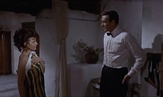 Goldfinger is especially notorious for the way it treats women. Forgetting for a second about Felix's wink-wink-nudge-nudging up the joint, none of the women Bond hangs out with are great characters. That starts with Bonita (Nadja Regin), the dancer in Mexico who betrays Bond. She has an interesting role to play, but the movie says nothing about why she does what she does. Is she committed to the drug dealers' cause? Is she just being paid? Is she afraid? The movie neither knows nor cares.