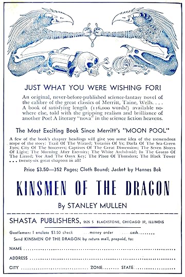 So again, I'm not often surprised. Until I was checking out an old copy of Ray Palmer's Imagination (one of those fantasy mags that look like science fiction). The inside cover of the second issue has a full page ad for Kinsmen of the Dragon by Stanley Mullen. The ad proclaims: "Just What You Were Wishing For!" and "The Most Exciting Book Since Merritt's Moon Pool." 352 pages for only $3.50.