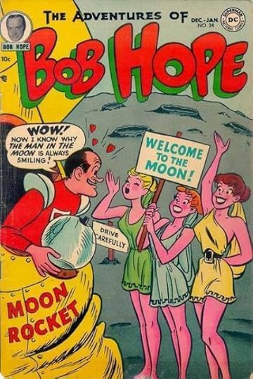 The next comic to try an outer space scenario was DC's The Adventures of Bob Hope #24 (January 1954), written by Cal Howard and drawn by Owen Fitzgerald. After selecting a space suit for a costume party, Bob falls in with an egg-headed scientist, Professor A Tomic Balmy, who has fourteen beautiful daughters (all with boys' names). Wanting to impress, Bob volunteers to take the scientist's rocket to the moon. The hero chickens out, jumps out of the rocket, and goes on a short rail journey before sending the professor a telegram that he has arrived on the moon. He buys a parachute and jumps into the crowd that gives him a ticker-tape parade. Sadly, Hope never actually leaves the Earth.This was followed by DC's The Adventures of Dean Martin and Jerry Lewis #34 (January 1957), again drawn by Owen Fitzgerald. Jerry, who is a member of the local boys' Junior Rocket Scouts runs into a beautiful woman professor (and her cute assistant) who is designing a flying saucer. After bailing Jerry out of jail, Dean manages to secure the job of guarding the saucer on its trip to Washington. During a test flight, Dean, Jerry, and the girls have an accident that sends them into space. After some lame jokes about the Milky Way and paper moons, the ship crashes back in DC. The professor is heart-broken, but the test is a success and the military funds her work. The story contains very little real science and few good jokes. Nine months later Sputnik would fly through the ether and America couldn't quite be as blithe about the possibilities of space flight.