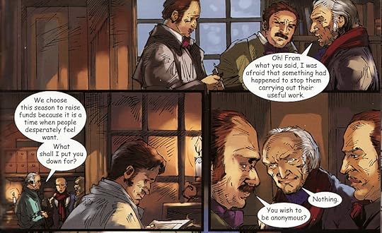 There do continue to be major flaws in the scene with the solicitors, but it opens with something that I mentioned last year that I like. As Fred is leaving Scrooge's office, Scrooge insults Cratchit for celebrating Christmas on his miserable salary. That's straight from Dickens, but in the original text Scrooge is muttering it to himself. In the Campfire comic, he's saying it out loud and the word balloons spill into the next panel where the solicitors are greeting Scrooge. What that suggests is that Scrooge is badmouthing his clerk - and revealing his salary - in front of potential customers. That's a bold, dickish action and I kind of love Scrooge for it.