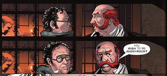 I also like the perturbed look that the lead solicitor (on the right) gives Scrooge in the first panel above. Rather than seem confused by Scrooge's comments, he appears to get it. Sadly, that doesn't make sense with the rest of the scene when the same character (inexplicably white-haired in the next panel) continues to press on with his pitch. There's also some awkwardness with the balloon placement in that third panel, making it look like Scrooge's "Nothing" is a response to the offer of anonymity.