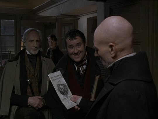 The lead solicitor introduces himself as Williams - his companion is Foster - and hands Scrooge a pamphlet that Scrooge doesn't yet look at. The men offer their sympathy, which immediately makes Scrooge suspicious. He nervously asks if they're relatives and I wonder if he suspects them of looking for an inheritance from the business. He's relieved when they explain that they're not, but his suspicions go up again when they use the word "generosity." He finally looks at their pamphlet and hands it back with a sigh.