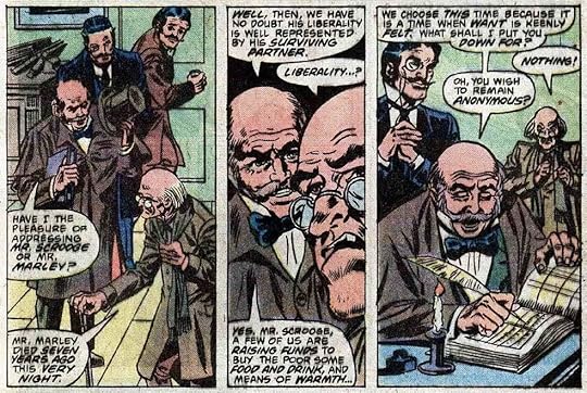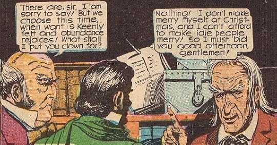 George D Lipscomb and Henry Kiefer's adaptation for Classics Illustrated only gives five panels to the charitable solicitors and cuts out huge chunks of the dialogue. They don't even have time to get confused about whether Scrooge is going to contribute. He makes it very clear that he won't and they very briefly try to change his mind before they give up and leave.