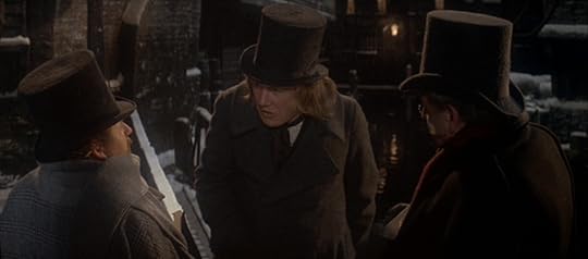 Though Scrooge is mean to them, he does it with a perfect, gentlemanly smile until they mention giving to the poor. At that point his grin drops and it's clear that he thinks they're complete lunatics. The conversation follows Dickens closely, which means that it's a little weird and the two, kind-hearted gentlemen come off as clueless at best and doddering at worst. They don't pick up on the clear message that Scrooge not only isn't interested, but is morally opposed to helping anyone but himself. With that, I'm back to understanding him again. I may not like him, but I get why he feels superior when surrounded by such fools.