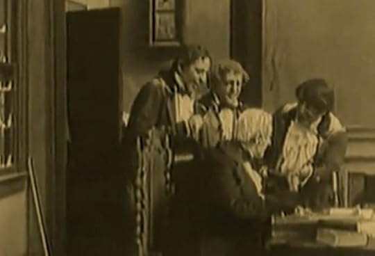 The effect of these two scenes is counter-productive to establishing Scrooge as a miserable person. Except for the intertitle calling him a "hard fisted miser," he could be anybody having a bad day and suffering constant interruptions to his work. I would likely be cranky too in his position and he seems justified in throwing out the bad-mannered Committee. We don't even know why Scrooge was fussing at Cratchit when he walked in, so even that could be deserved.
