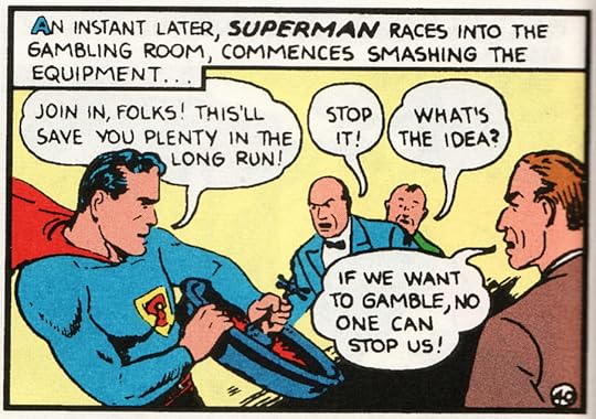 Continuing his defense of the oppressed, Superman takes on gambling rings in Action Comics #16 (by Jerry Siegel and Joe Shuster).