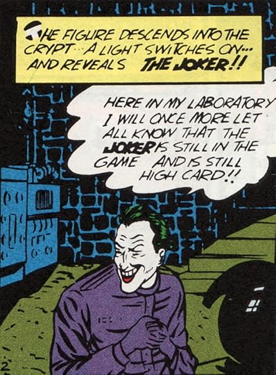 In the fourth and final story in Batman #1 (again by Bill Finger, Bob Kane, and Jerry Robinson), the Joker escapes prison after only two days there and picks up right where he left off. He declares that he wants to "let all know" that he's "still in the game and is still high card." It's not enough to commit the crimes and get away with it; he also has to rub it in the public's face.