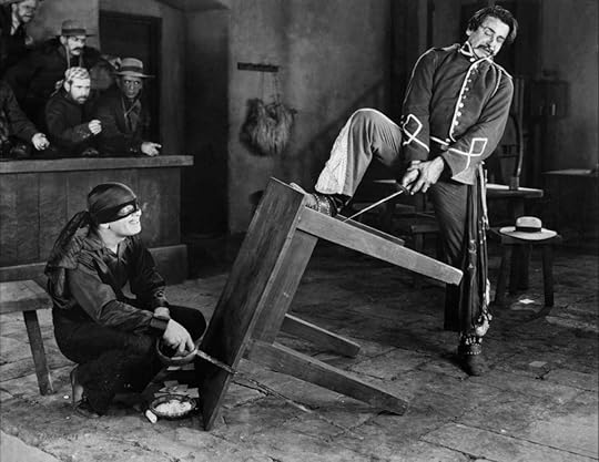 Batman could take some more lessons from Fairbanks' Zorro on playing the idle playboy, though. Fairbanks' performance as Don Diego is brilliant. He always looks exhausted and bored, only perking up when he's irritating someone with an unwanted handkerchief trick. Christopher Reeve rightly gets a lot of praise for creating separate performances when he's playing Superman or Clark Kent, but he wasn't the first to do that. Fairbanks does the same thing as Don Diego and Zorro and I totally see why people are fooled.