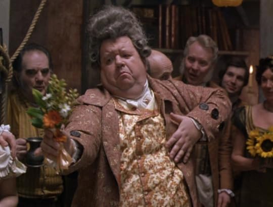 There are a few other employees in the warehouse, with Fezziwig on a raised platform standing at a tall desk. His wig isn't Welsh, but it's the most elaborate I've seen yet with a high, bouffant shape and ridiculous little curls at his temples. He's also probably the most overweight Fezziwig so far. I recognize actor Ian McNeice from Ace Ventura: When Nature Calls and - more recently - Winston Churchill on a few episodes of Doctor Who.