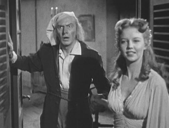 Scrooge is deeply affected by being here and the Spirit notices that he's trembling. He blames it on the cold, as he also does later when she notices something on his cheek (which is good, because in Dickens, Scrooge tries to claim that the thing on his cheek is a pimple instead of a tear and that's super lame). I really enjoy their interactions in this version. Scrooge has a huge smile on his face and is enjoying this, only sobering when the Spirit tosses straight-faced zingers at him to make him think. She sets him up ("You remember this way?"), lets him respond enthusiastically ("Remember it? I could walk it blindfold!"), then sweetly nails him ("Strange to have forgotten it for so many years") before leading the way herself. Maybe I'm just in love with Ann Rutherford, but the way she plays Scrooge and his emotions is beautiful to watch. It doesn't appear to bother Scrooge, either. She's so gentle about it that he's smiling even after she's stung him.