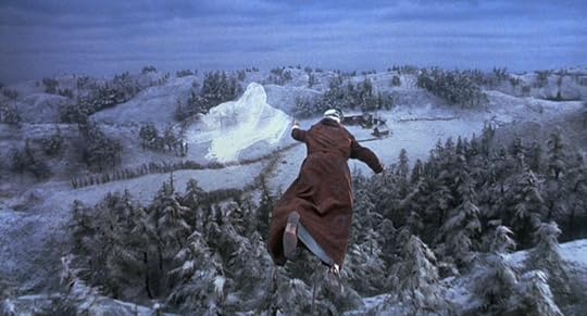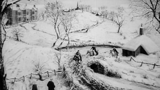 The 1938 Christmas Carol has the Spirit leading Scrooge out of his window and in a flight, first over the city of London, but that fades and becomes a snowy country scene. (I don't know how this section was shot, but I assume the filmmakers created miniatures and they are amazing.) Scrooge is already smiling while still in the air. He's got no fear of falling at this point and seems to be enjoying himself. I don't know if he recognizes the specific places yet, but it may be bringing back childhood memories already.