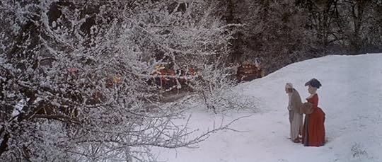 Director Clive Donner likes using close ups of the spirits' icons to represent transitions. For Christmas Past, its her snuffing cap, so when she transports Scrooge to the country, Donner shows us the hat with a snowy forest and building projected onto it. This fades into Scrooge and the Ghost standing in some trees on the side of a snowy road.