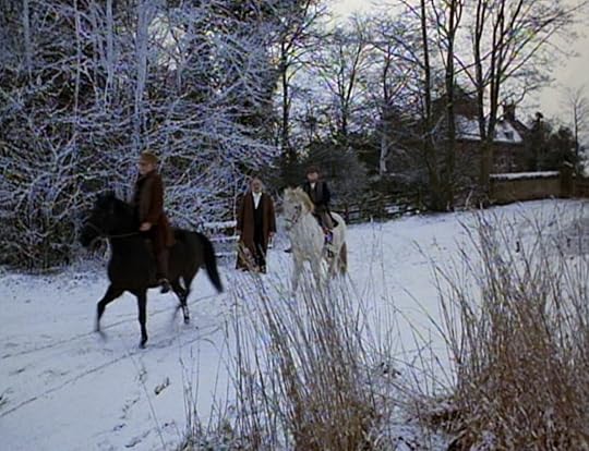 As Scrooge and the Spirit talk about this being where Scrooge grew up, riders on horseback appear from behind a building and cross the bridge. They might be students leaving for the holidays, but neither Scrooge nor the ghost mentions or addresses them. Scrooge is distracted by the sight of his school, which he says looks lonely and deserted. "Not quite deserted," corrects the Ghost.