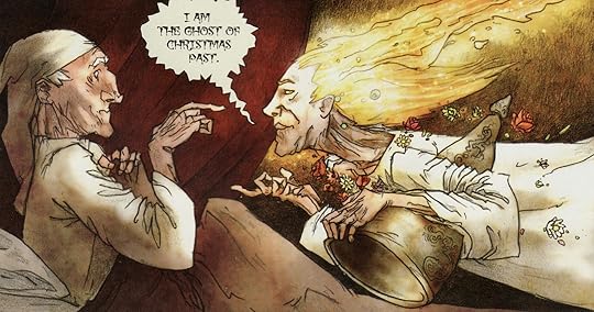 Panel four is the one above. The Spirit is relatively androgynous; perhaps leaning towards masculine. And it's neither young nor old, but middle-aged. I'm not crazy about that, but I do like the choice to give the Spirit flames for hair. That suggests the flickering nature of the ghost and also provides a source for the light emanating from its head. The holly branch is replaced by a garland that the Spirit wears as a necklace. The cap is there, but Scrooge calls no attention to it and it serves no purpose other than to be faithful to Dickens.