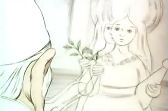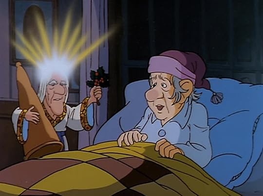 I use the singular there, because that's what we get in this version. A title card announces that the new figure is "the Spirit of Christmas." Its first job is to help Scrooge recall "incidents of his youth and early manhood," but it's going to be responsible for ushering Scrooge through the Present and Yet to Come, too. For that reason, it's almost not worth comparing its appearance to Dickens' Spirit of Christmas Past, but it does pull the long white hair from there. In most other ways, it resembles the Spirit of Christmas Present.