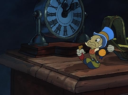 He does fall asleep and we get a nice POV shot of something bouncing into the room and landing on Scrooge's nightstand. It's Jiminy Cricket, who raps his umbrella on the bells of Scooge's clock. That's all the chiming we'll get, but this Marley never made any predictions about what time the spirits would show up. In fact, Scrooge's clock says that it's not quite ten minutes after midnight. So no waiting around 'til one this time.