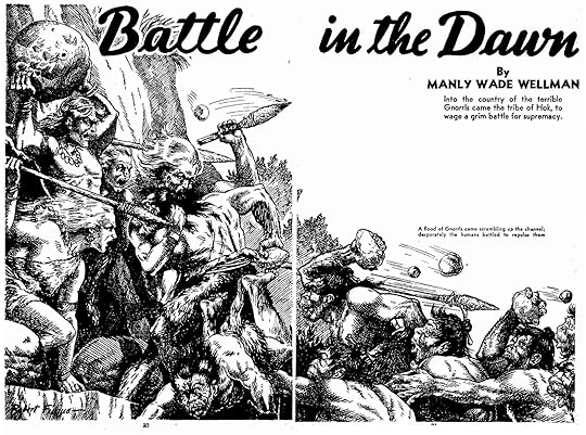 The first Hok story is "Battle in the Dawn" (Amazing Stories, January 1939). The plot is pretty simple. Hok and his band come to a land rich in game, but encounter the local neanderthals (known as Gnorrls). After stealing one of their winter homes, Hok swells their ranks by venturing south and finding a bride. He also saves her brother who has been captured by the Gnorrls so they can steal the human secret of making and using javelins. In the end, the small human band must face an army of a thousand neanderthals, which they defeat at great cost. The story is savage, unforgiving, and realistically brutal. Only the wooing of Oloana reminded me a little of ERB, and that in a very truncated form. The romance element also reminded me of Howard Browne's "Warrior of the Dawn" (Amazing Stories, December 1942). Did Wellman as well as Burroughs inspire Browne?