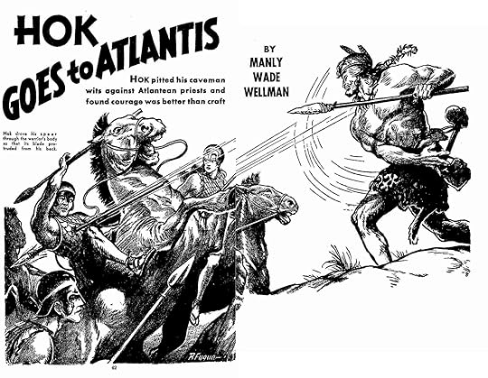The first Hok story is "Battle in the Dawn" (Amazing Stories, January 1939). The plot is pretty simple. Hok and his band come to a land rich in game, but encounter the local neanderthals (known as Gnorrls). After stealing one of their winter homes, Hok swells their ranks by venturing south and finding a bride. He also saves her brother who has been captured by the Gnorrls so they can steal the human secret of making and using javelins. In the end, the small human band must face an army of a thousand neanderthals, which they defeat at great cost. The story is savage, unforgiving, and realistically brutal. Only the wooing of Oloana reminded me a little of ERB, and that in a very truncated form. The romance element also reminded me of Howard Browne's "Warrior of the Dawn" (Amazing Stories, December 1942). Did Wellman as well as Burroughs inspire Browne?Wellman continued his series with "Hok Goes to Atlantis" (Amazing Stories, December 1939) where the caveman sees many wonders. He also runs afoul of Cos, the perverse king, and has the beautiful Maie fall in love with him. But Hok doesn't abandon Oloana for the queen. As with all love triangles, this is bad news for somebody: Maie. She dies in a bloody battle; a warrior's death for a warrior queen. Of course, it all ends with Tlantis sinking into the ocean and the legend starting. Wellman would use the other end of things with his Kardios series; he being the last survivor of the disaster (which through implication, he was also responsible for on some level). Also, I see how the Tlaneans may have inspired Howard Browne's civilized characters in Warrior of the Dawn, which appeared in Amazing three years later. Finished with the adventure, but richer in knowledge, Hok turns his back on such modern ideas as riding horses, using gunpowder, bronze weaponry, and feudal society. He prefers his simple caveman ways. He does keep a club with a gigantic diamond head, though.