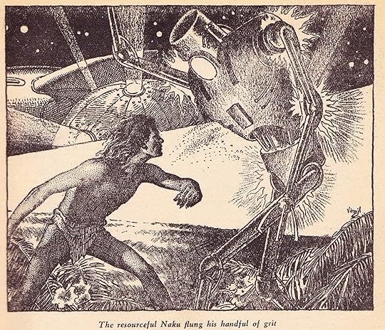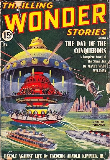 There is one other story that lies close to the Hok series, "The Day of the Conquerers" (Thrilling Wonder Stories, January 1940), appearing after the first two Hok stories. In this science fiction tale, Martians armed with death rays and robots come to Earth to take over the planet. They are faced with an able opponent in Naku (or Lone Hunt), one of the Flint People. Since he is armed with a bow, the story must take place chronologically after Hok's life, for Hok invented the weapon and he makes no reference to alien invaders. So, Naku is one of Hok's descendants and a worthy warrior and cunning fighter.