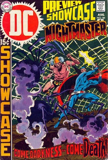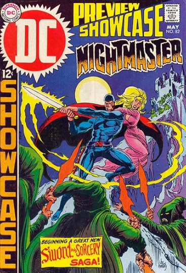 “In a Far off Land” set the pattern for a longer version of this test entitled Nightmaster, using the same man-from-our-world goes to a fantasy realm (what we now call portal fantasy) and has poorly hidden jokes in the names. The three-parter (each bearing a Joe Kubert cover), beginning with DC Showcase #82 (May 1969), was written by Denny O’Neil, a writer who had penned Charlton’s Adventures of the Man-God Hercules under the pseudonym Sergius O'Shaugnessy. This first issue was illustrated by Jerry Grandenetti and Dick Giordano. Grandenetti had drawn several sword-and-sorcery pieces for Warren. The first issue tells how rock musician Jim Rook transcends dimensions to Myrra, a land of fantastic creatures. He meets King Zolto, who relates how Rook is the descendant of Nacht (German for "night"), a hero sent to our dimension by the wizard Farben. Zolto arms Rook with the Sword of Night and sends him to defeat the Warlocks who hold his fiancee, Janet Jones (long before Gretzky). Rook’s assistant is a strange boy named Boz (the character is entirely white and never really explained). Before Rook (now titled Nightmaster and given a rather superhero-looking costume) can defeat the Warlocks, he has to pass through a magical gate. To do this he needs the three magic words from the Ice Witch. The duo ride giant grasshoppers to her mountain and scale the steep walls while Warlock troopers throw icicles at them, but finally defeat the witch after she assumes Janet’s appearance. End of Part One.