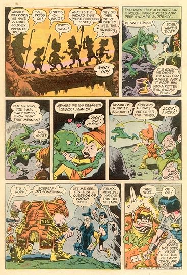 “The Survivor” in Weird War Tales #15 (July 1973) was written by Jack Oleck and drawn by Gerry Talaoc. Oleck was a mainstay of the DC horror titles, and not surprisingly, he wrote more of the stories featured here than anyone else. Here is the first of two about Vikings. Lars Ironhand and his crew are stranded on a weird island where the monsters of Throna the Witch attack them. Defeating all her minions, Throna leads them to water. Drinking the liquid causes the Vikings to grow small in body but large in head. Lars, the last survivor, writes a warning to anyone else who might end up on the island and be changed by the water. By the time he finishes, he has changed into a monkey.“King of the Ring” from Plop #23 (September-October 1976) is an unusual outlier that has to be mentioned. Written and drawn by Wally Wood, the strip is one of the first comic parodies of The Lord of the Rings in the manner of Harvard Lampoon’s Bored of the Rings. While not sword-and-sorcery exactly, the funny piece packs many of the highlights and characters of Tolkien’s masterpiece into only six pages. Woody uses silly variations such as Gondeaf for Gandalf and Snyder for Rider, etc. He has a crew of dwarves with names like Slappy, Droopy, Sleazy, Groucho, Harpo, Snoopy, and Shlepo. There is an incognito king who announces he is incognito, the frog-like Glum who wants his “sweetums,” Nazighuls, norks, Schlob, and the ring finally gets destroyed when Frodo shoves Glum over the edge. Wood ends it with the ring flying out of Mount Doom to Gondeaf’s hand. The wizard decides to keep the ring and be evil. Drawn with Wood’s best Mad Magazine-meets-The King of the World style, it is a classic parody.