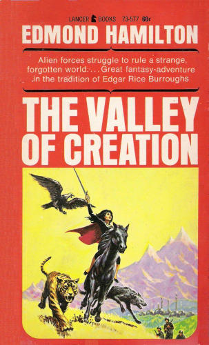 The only paperback I had by Edmond Hamilton was a copy of Lancer's The Valley of Creation (1967). This was the red reprint version with a swordswoman riding a black horse alongside her pet hawk and tiger. In the background, armed space marines watch her ride by. (I'm pretty sure the cover art was by Gray Morrow.) The blurb says, "In the Tradition of Edgar Rice Burroughs." Another edition uses the words: "Sword and Sorcery." Those Lancer people really wanted me to buy this book. Because usually that's all it would have taken. I did buy it or acquired it second-hand. I never read it back then.