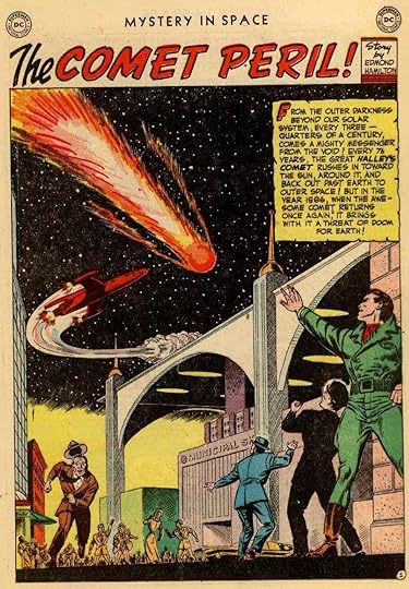 Hamilton did get a chance to revisit this story idea when he wrote "The Comet Doom" for DC's Mystery in Space #2 (June-July 1951). In this ten-page comic story there are no robots. Set in 1986, the next year that Halley's Comet would appear, Hamilton gives his future vision. This, of course, is hilarious for anyone who was around in the '80s and remembers how it really went. Hamilton's version has rocket-planes that travel from LA to New York in an hour and are commonly used instead of cars. There is tele-news on some new-fangled thing called a television. With the comet's passing, the earth begins to follow Halley's Comet in space. A group of scientists go to the North Pole to cut the tether that attaches the comet magnetically to Earth. They are sucked into the beam and land on the comet where they discover a solid planetoid and air and a city and the weird comet-folk who are floating globes. The lead scientist, Dr Stanton, talks with the aliens and his friends think he has betrayed them. The scientists rush the control panel, knocking Stanton over and fatally wounding him. Before he dies, he explains that the comet-folk wanted to move the planet because of deadly sunspot activity. The world is saved, but Stanton dies, Earth's greatest hero. Many of the elements are the same but inverted in this second version. In his second career as a comic-book writer, Hamilton again innovated in the pages of DC comics.