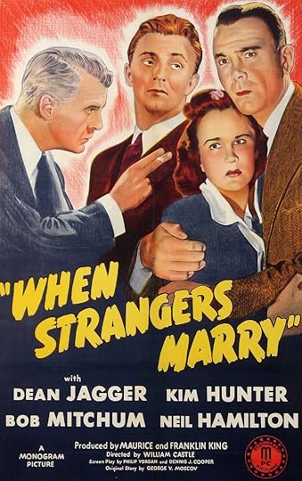 When Strangers Marry is a good thriller in which Hunter marries a guy (Jagger) she's only known a short time. The cops (led by Hamilton) want to bring Jagger in for questioning about a murder in the last town Jagger was in, but he's doing his best to stay off the grid. Hunter starts to wonder what she's gotten herself into and whether she shouldn't have married her childhood sweetheart (Mitchum) who's recently re-entered her life, instead.