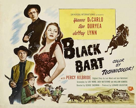 Between this and Frontier Gal , I'm pretty much done with Yvonne De Carlo Westerns. Or at least with seeking out Westerns specifically because she was in them. She may be Lily Munster - and she's certainly gorgeous - but man does she play some miserable characters. Black Bart isn't focused on rape the way that Frontier Gal was, but it's still about a supposedly strong-willed woman who bends to a man's wishes simply because he's the man.