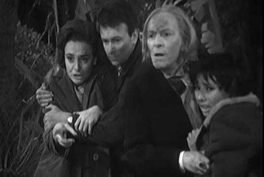 DOCTOR: Quench the fire. Take the fire away from them. Scaring them, somehow. SUSAN: (putting a skull on top of a burning brand) Hey, Grandfather, look! It's almost alive. IAN: Not alive, Susan. Almost dead. We're going to make four torches. We'll find the sticks. And we'll use the fat from the meat. And then SUSAN: And then? IAN: And then, to all intents and purposes, we're going to die.